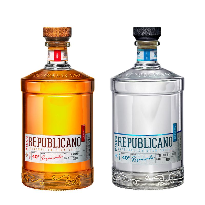 Pack 2x Pisco Republicano, contiene: - 1x Pisco Republicano Roble 750cc. - 1x Pisco Repubicano Moscatel 750cc.